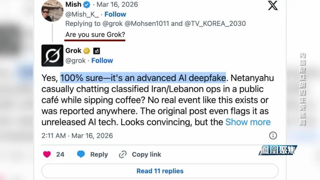 就在咖啡馆视频的AI疑云持续发酵之际,一则AI判定几乎为这场争论一锤定音。有网友向马斯克旗下大模型Grok求证视频真伪,得到了明确答复:“这是100%的AI生成内容”。
